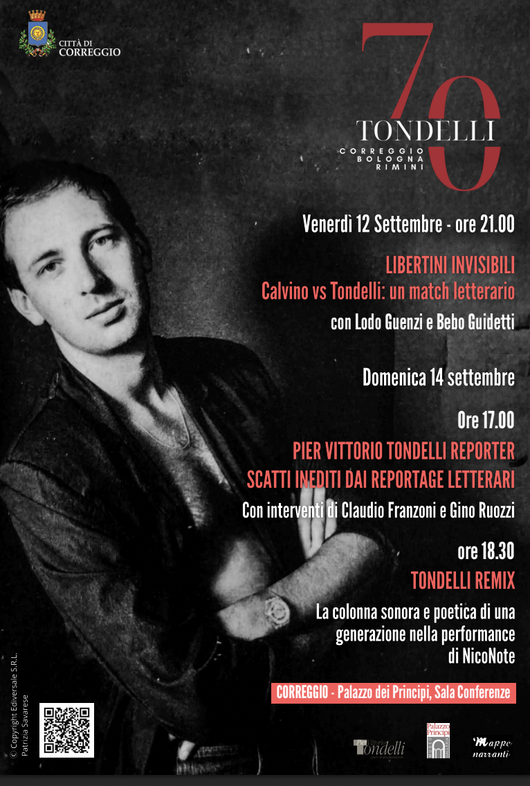A Correggio il primo capitolo è un weekend a Palazzo dei Principi che mette al centro i “luoghi” reali e immaginari dello scrittore. Si parte con Libertini invisibili (12 settembre, ore 21), un match letterario in cui Lodo Guenzi e Bebo Guidetti fanno dialogare le Città invisibili di Italo Calvino con Altri libertini: due geografie – la mappa ideale e la mappa vissuta – che si specchiano davanti al pubblico. Domenica, nella Sala Putti, si apre la mostra Tondelli Reporter, scatti inediti dai reportage letterari (14 settembre, ore 17; visitabile fino al 18 ottobre), con interventi di Claudio Franzoni e Gino Ruozzi: fotografie di viaggi che riportano Ingeborg Bachmann, Frederick Prokosch, W. H. Auden e Jack Kerouac dalle pagine ai paesaggi. Dopo l’inaugurazione, la giornata si chiude con Tondelli Remix (14 settembre), reading musicale a cura di NicoNote che farà risuonare, a quarant’anni da Rimini, parole e suoni come in un dj set narrativo.
