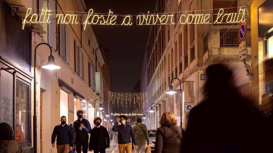 Quindici versi tratti dalla Divina Commedia, sei vie del centro storico e tutt’attorno l’atmosfera del Natale: dal 27 novembre 2020 al 6 gennaio 2021 le strade di Ravenna si illuminano di “beltà” grazie al progetto “La luce delle parole”, una lunga scia di installazioni luminose che propongono alla vista e al cuore dei passanti alcuni dei più emblematici versi del Sommo Poeta, molti dei quali proprio dedicati alla città in cui si spense nel 1321.