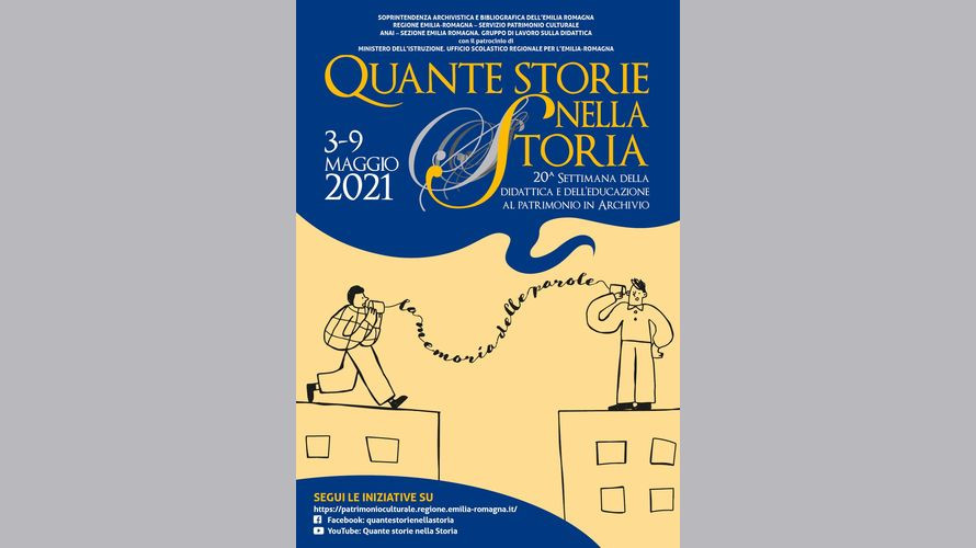 “Quante storie nella Storia. Settimana della didattica e dell’educazione al patrimonio in archivio” è un’iniziativa promossa dal Servizio Patrimonio culturale della Regione Emilia-Romagna in collaborazione con la Sezione Emilia Romagna dell’ANAI – Associazione nazionale archivistica italiana e con la Soprintendenza archivistica e bibliografica dell’Emilia Romagna. L’Ufficio scolastico regionale per l’Emilia-Romagna ha concesso il patrocinio alla manifestazione per la rilevanza culturale e l’interesse per la comunità scolastica.